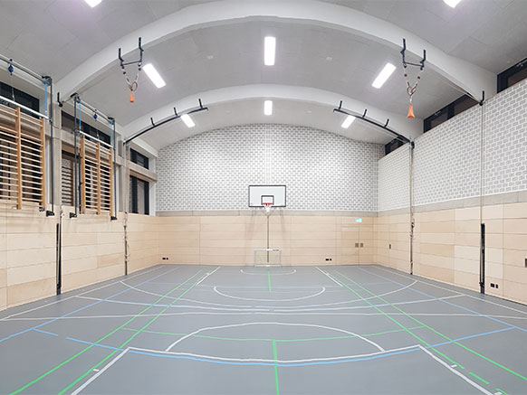 Sanierung der Sport- und Mehrzweckhalle. Unsere Leistung: Planung, Demontage, Lieferung und Einbau von Sportgeräten. Der Auftrag wurde 2020 abgeschlossen.